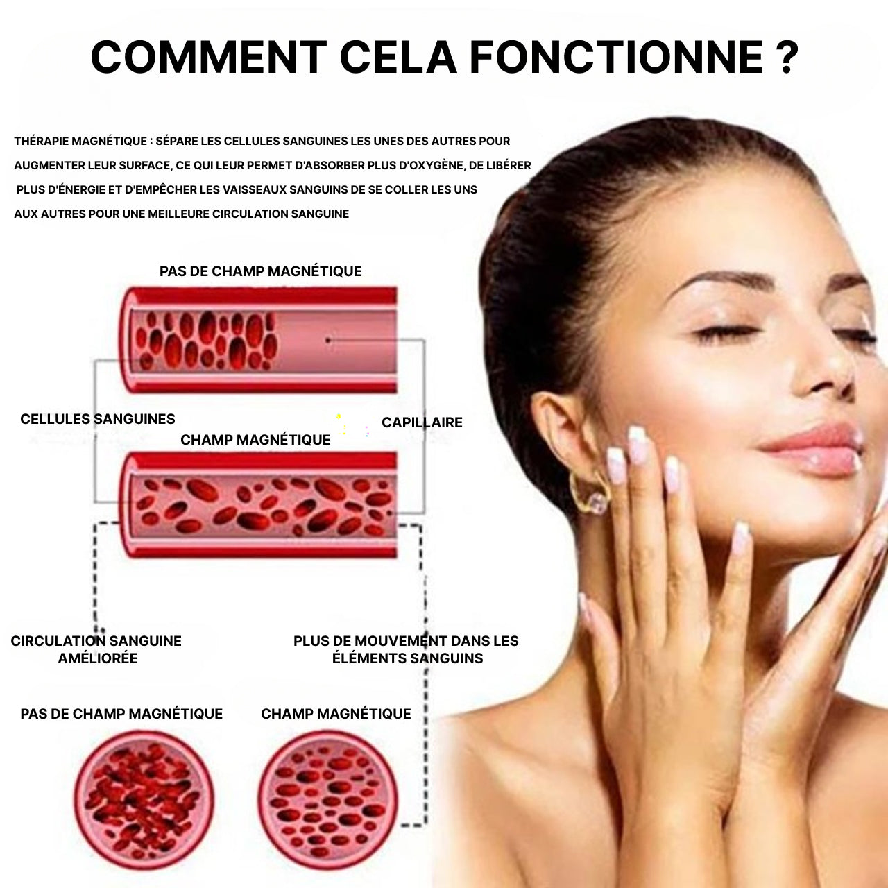 La thérapie magnétique intégrée est pensée pour agir sur certains points d'acupression, dans une intention d'accompagnement de l'élimination des toxines et de la gestion de la rétention d'eau, en lien avec une sensation de légèreté et de vitalité.