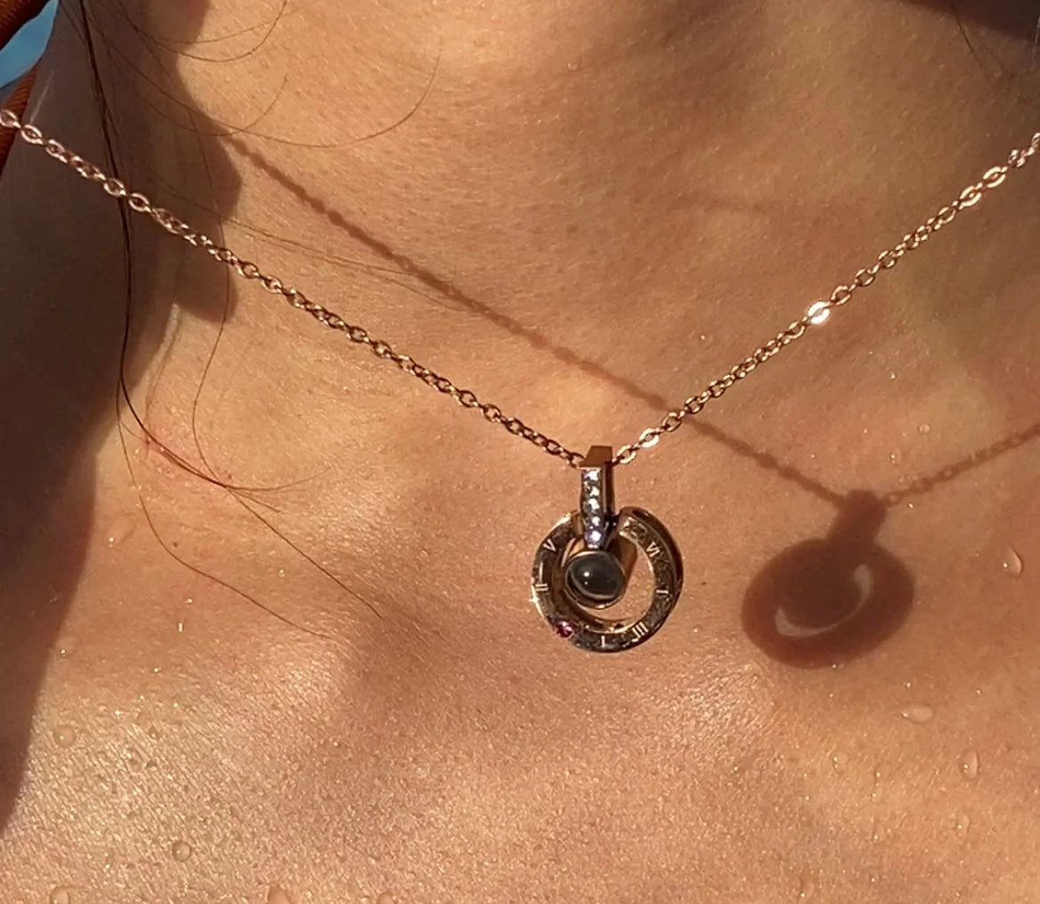 Ce collier soigneusement conçu est doté d'un pendentif sur lequel est gravé "Je t'aime" en 100 langues différentes.